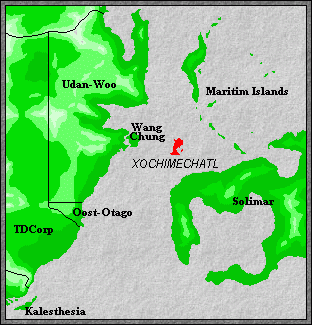 The Theocracy of Xochimechatl is an island state. The island, also called Xochimechatl, is located in the Cislendian Ocean, to the west of the Maritim Island chain and quite close to the continent of Melania, where Xochimechatl culture originated. Also quite close to Xochimechatl is the island of Wang Chung, colonised by settlers from the Old Continents.